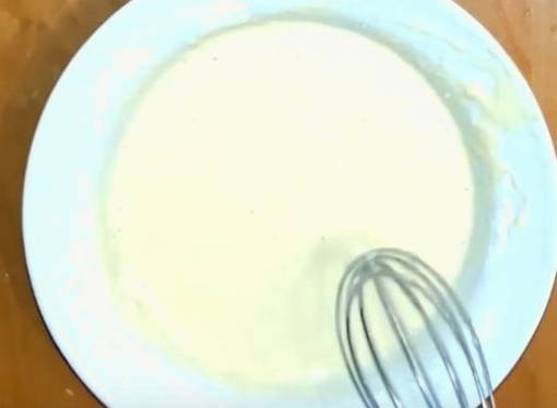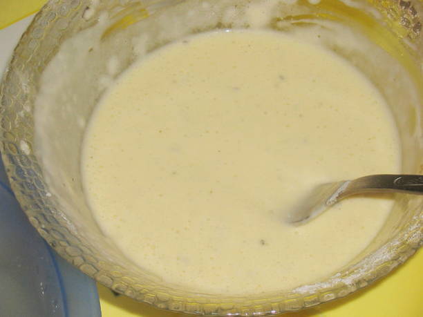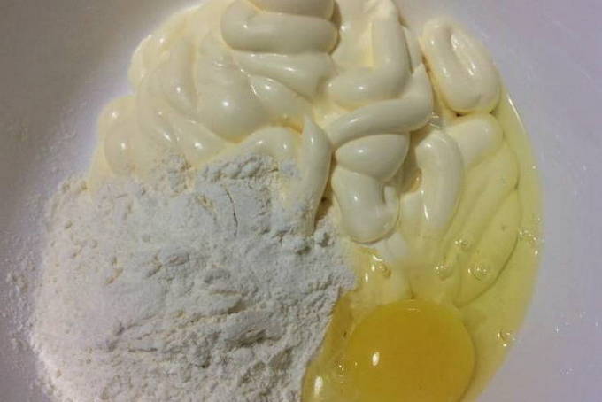 - Ga dan voor het beslag. Om dit te doen, moet je het kippenei, mayonaise, zout en een snufje suiker mengen. Giet als laatste de gezeefde bloem erin. Meng grondig. Controleer het beslag op viscositeit. Om dit te doen, dompelt u er een lepel in, het beslag moet in een dunne laag op het oppervlak blijven en niet uitlekken.