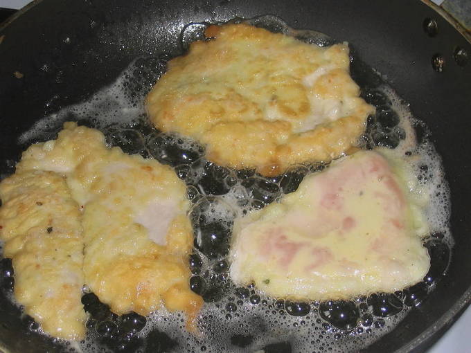Verwarm een koekenpan voor, giet er plantaardige olie in. Schik het keukengerei in de volgende volgorde: een bord met karbonades, een bak met beslag, een koekenpan, een bord voor in beslag gebakken filets. Dit moet worden gedaan zodat het beslag geen tijd heeft om van de kipfilet af te tappen terwijl je het in de pan doet. Bak de karbonades 3-4 minuten aan de ene kant en aan de andere kant in het beslag. Het beslag moet in deze tijd goudbruin worden.