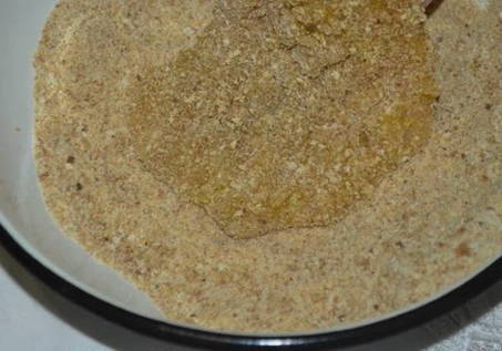 - Rol de kipkotelet vervolgens aan beide kanten door het paneermeel. Herhaal de manipulatie nog een keer. Hierdoor worden de karbonades lekkerder.
