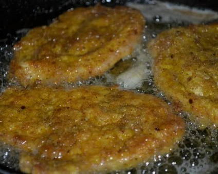 - Verhit een koekenpan met plantaardige olie, zet het vuur iets lager. Karbonades in beslag en paneermeel worden het best gekookt in diep vet of in een grote hoeveelheid plantaardige olie in een pan. Dus heb geen medelijden met hem. Leg de karbonades in een koekenpan en bak ze 5 minuten aan de ene en aan de andere kant. Pas op dat de crackers niet verbranden.