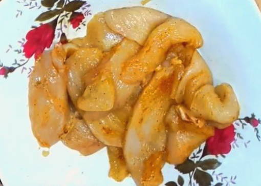 - Doe de gesneden filetstukjes in een diepe bak, bestrooi met paprika, kerrie, zwarte peper en natuurlijk zout. Meng de ingrediënten en verdeel de kruiden over alle stukken vlees. Pel de knoflookteentjes, spoel ze af en snijd ze in stukjes. Laten we het naar kippenvlees sturen. Meng opnieuw. Bedek de container met een deksel of draai hem vast met folie en laat de kip marineren. Als je genoeg tijd hebt, kun je het minstens een uur in de koelkast zetten, bij kamertemperatuur is het genoeg voor 20-30 minuten.
