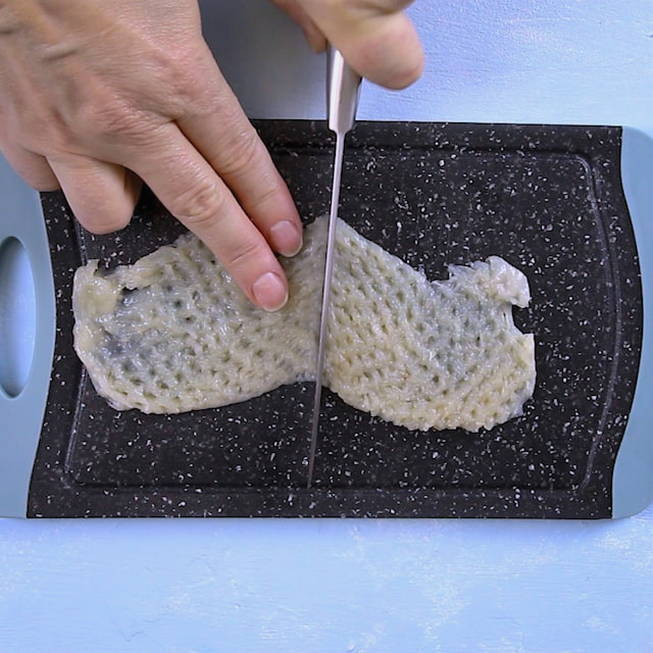 - Spoel de kipfilet af met koud water en dep droog met keukenpapier om overtollig vocht te verwijderen. Snijd het vet eraf en verwijder de folie, indien aanwezig. Snijd elke filet in 4 stukken. Klop de filetstukjes los met een speciale hamer en bedek ze met huishoudfolie of perkament (hierdoor blijft het werkvlak schoon).