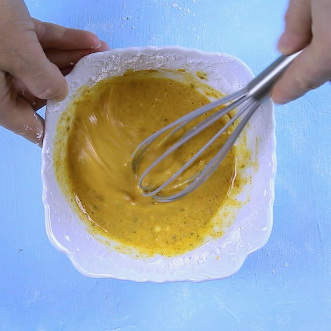 - Zorg voor het beslag. Breek de eieren in een diepe kom, voeg zetmeel en kruiden naar smaak toe. Zorg ervoor dat je kurkuma gebruikt, het zal niet alleen helpen om de smaak van het gerecht te onthullen, maar het ook een rijke kleur te geven. Breng op smaak met zout en roer tot een gladde massa. In consistentie moet het beslag zijn als vloeibare zure room.