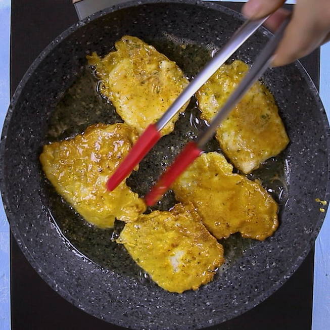 - Als het beslag is afgekoeld is de kipfilet net gemarineerd. Zet tegen die tijd een koekenpan op het fornuis en verwarm deze door plantaardige olie te gieten.Omdat het beslag vrij vloeibaar is, kun je stukjes kip er direct boven de pan in dopen en direct laten bakken. Bak de kipfilet aan elke kant goudbruin.