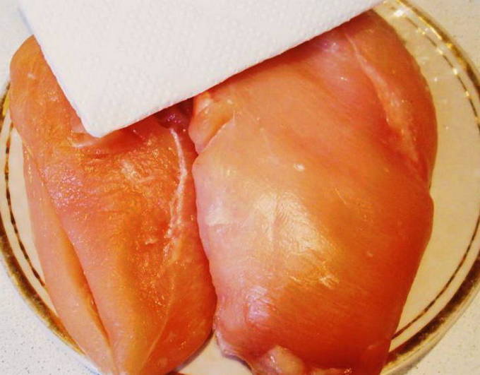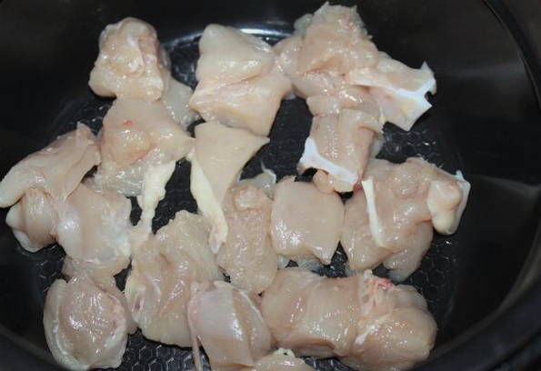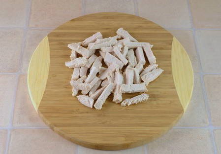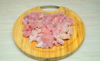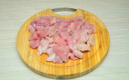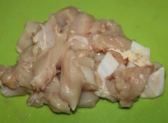 - We nemen de kipfilet, verwijderen de schil ervan en snijden de filets van de botten. Snijd het in middelgrote stukken.