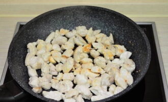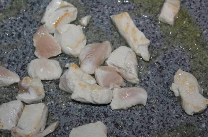 Neem een koekenpan en verhit er 2 eetlepels plantaardige olie op. Bak de kip erop tot hij een beetje goudbruin is.