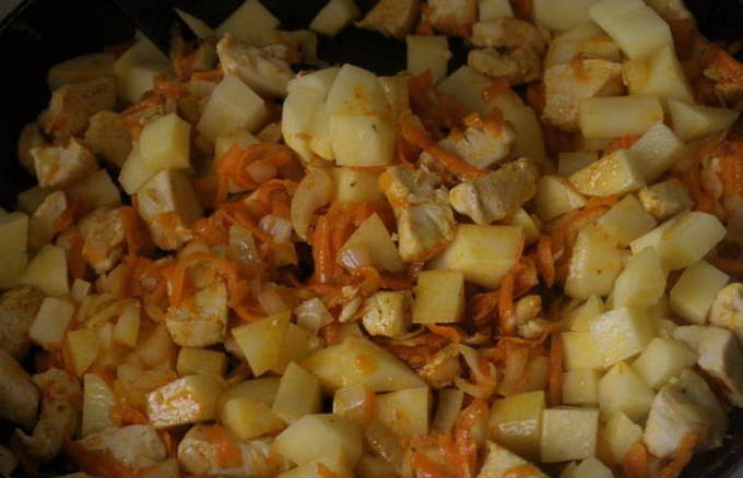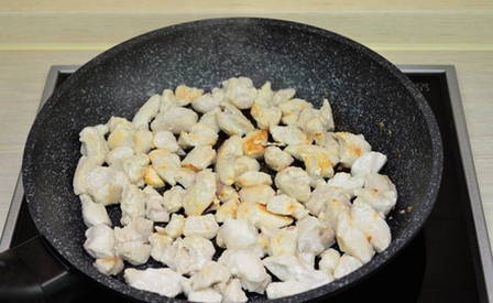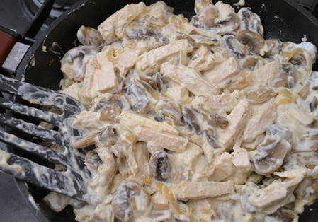 Kipfilet wordt gekookt. Uien met champignons en zure roomsaus worden apart gebakken in een koekenpan. Vervolgens wordt de afgewerkte kip gesneden en naar de pan gestuurd. Het afgewerkte gerecht is zacht en aromatisch.