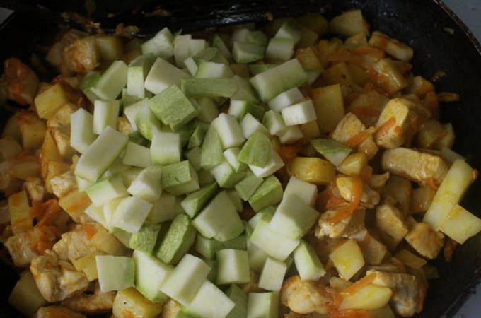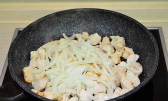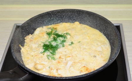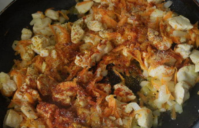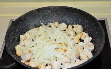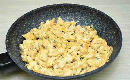 - Doe de gehakte kipfilet in een koekenpan met uien en champignons, voeg zout en peper naar smaak toe. Giet vervolgens zure room met nootmuskaat en meng goed. We blijven nog 3 minuten op laag vuur koken.