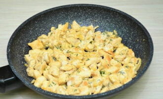 Voeg nu zure room toe. Was de dille onder koud water, hak hem fijn en stuur hem ook naar de pan. We koken 200 ml. water en giet het in de kip met zure room. Meng goed en laat op laag vuur ongeveer 5-10 minuten sudderen.