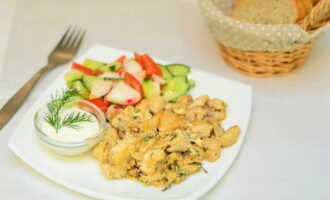De kip wordt gebakken met uien, vervolgens worden er zure room, dille en heet water aan toegevoegd. Als gevolg hiervan wordt een sappige kipfilet verkregen, die ideaal zal worden gecombineerd met elk bijgerecht.
