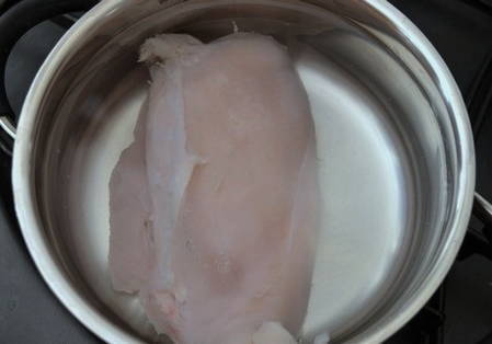 - Was de kipfilet goed, doe hem in een pan, vul hem met water en kook ongeveer 20 minuten nadat het water kookt. Laat het een beetje afkoelen.