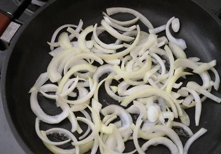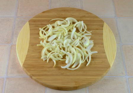 - Pel de uien en snijd ze in dunne halve ringen.