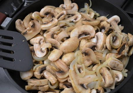 - Vervolgens sturen we de champignons daarheen, mengen en bakken ongeveer 15-20 minuten, totdat al het gevormde water is weggekookt.
