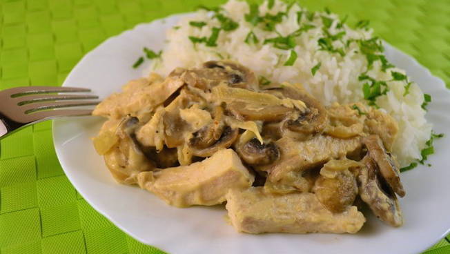 Sappige kipfilet met champignons in zure roomsaus