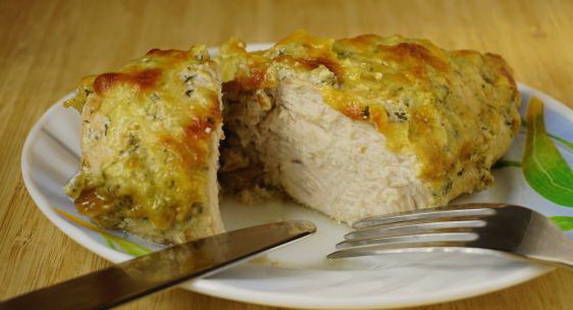 Eerst wordt de kip gemarineerd in sojasaus, plantaardige olie, citroensap en honing. Vervolgens wordt een saus gemaakt van knoflook, zure room, zout, suiker, peper en dille.Kipfilet wordt met saus gegoten, besprenkeld met mozzarella erop en 45-50 minuten gebakken. Het blijkt erg sappig en smakelijk te zijn.