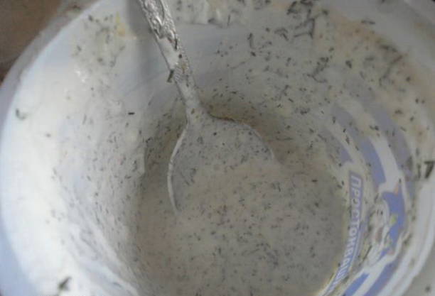 - We verplaatsen de knoflook in een aparte container, voegen daar zure room, zout, gemalen zwarte peper en suiker toe.