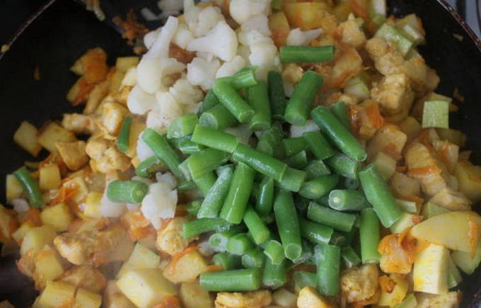 - Voeg als laatste de bevroren bloemkool en bonen toe. Wij mixen.