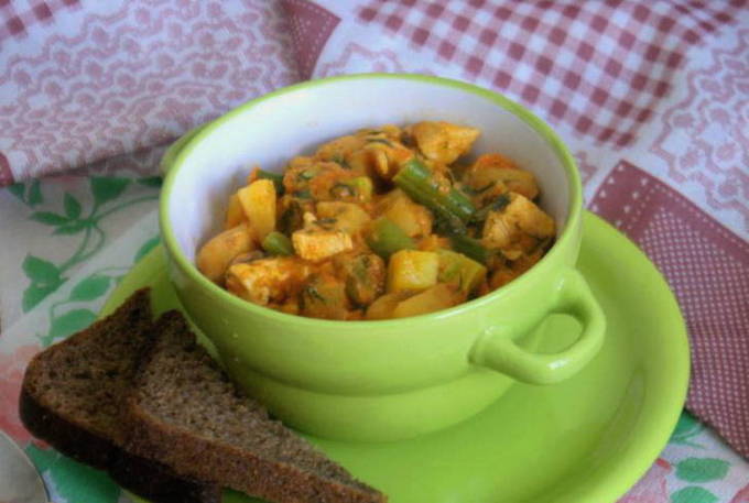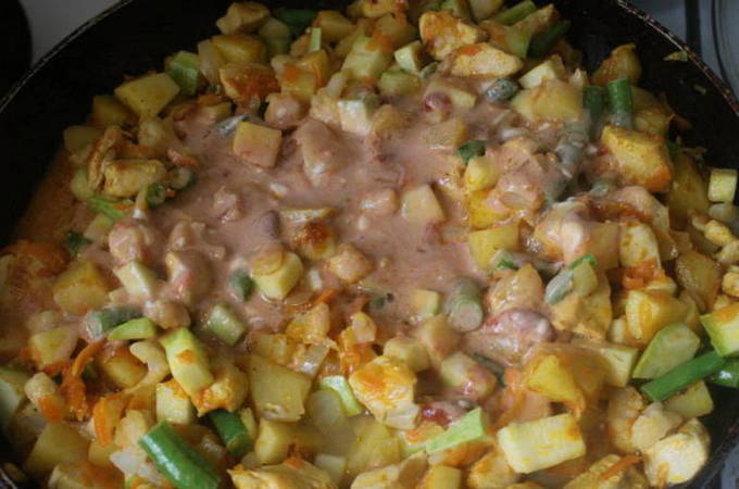Kip wordt gebakken in een pan met wortelen, uien, bloemkool, aardappelen en courgette. Vervolgens worden er tomatenpuree en zure roomsaus aan toegevoegd. Strooi verse dille over het afgewerkte gerecht.