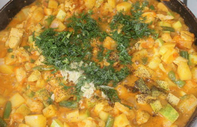 - Als alle groenten gaar zijn, voeg je gehakte knoflook met dille toe, roer en haal van het vuur. Bedek de pan met een deksel en laat het gerecht een paar minuten trekken.