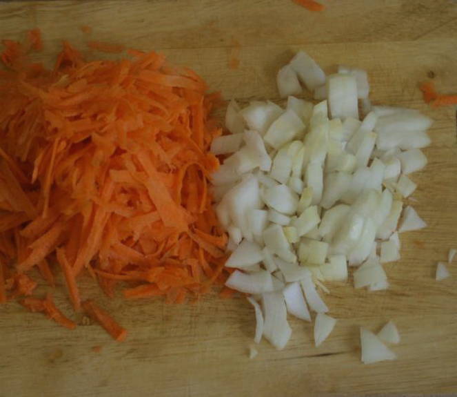 - Schil en rasp de wortelen en snijd de ui in kleine blokjes.
