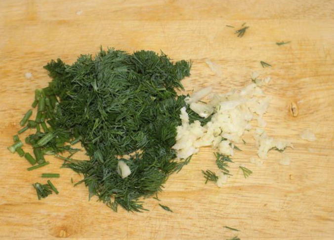 - We wassen de dille onder koud water en hakken samen met de knoflook fijn.