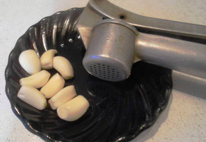 - Pel de knoflook en haal hem door een pers of hak hem heel fijn met een mes.