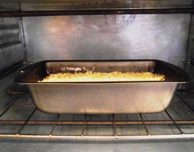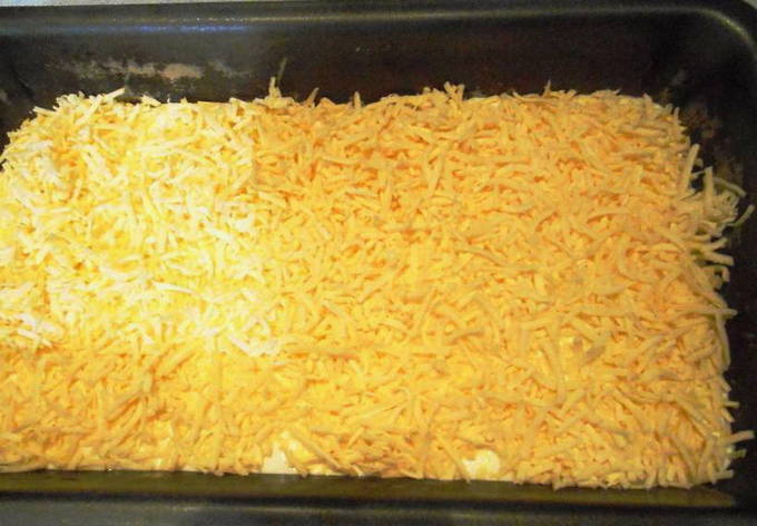 - Wrijf de mozzarella op een middelgrote rasp. Doe de inhoud van de pan in een ovenschaal en strooi er geraspte kaas over. Verwarm de oven voor op 180OC en zet de vorm daar een paar minuten zodat de kaas smelt. Je kunt dit ook in de magnetron doen.