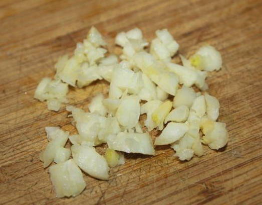 - Vervolgens gaan we verder met de bereiding van zure roomsaus. Pel de knoflook en hak fijn met een mes. Voeg een beetje zout toe zodat het sap eruit begint te komen.