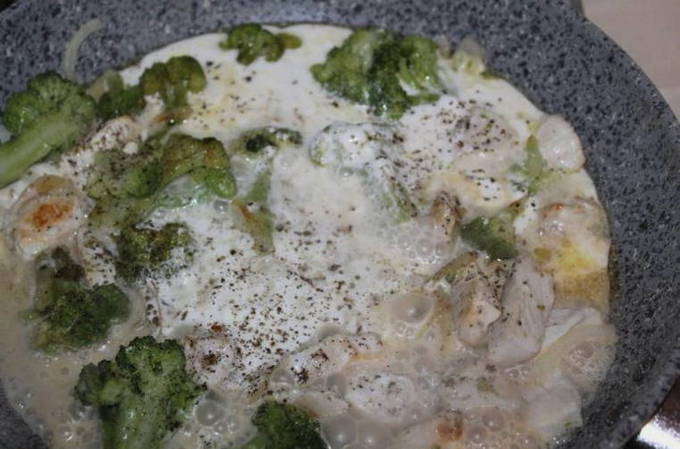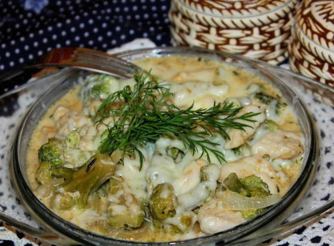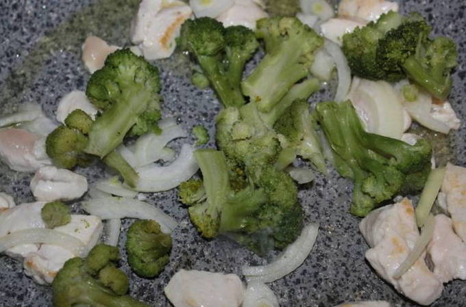 Om te beginnen wordt de kipfilet gebakken samen met uien en broccoli. Dan worden daar zure room, water en kruiden toegevoegd. Aan het einde wordt de inhoud van de pan overgebracht naar een ovenschaal, bestrooid met kaas en gedurende 2 minuten naar de oven gestuurd.
