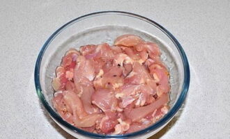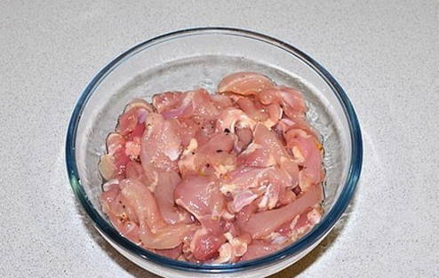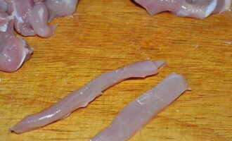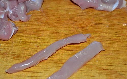 Kippendijenfilet moet volledig vrij zijn van zaden en films. Snijd het product in dunne reepjes.