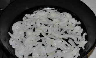 Snijd de uien in dunne halve ringen. Bak de groente tot ze zacht zijn in een pan met plantaardige olie.