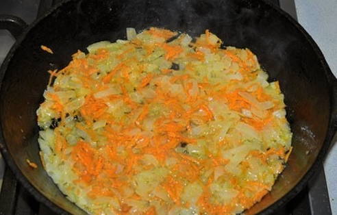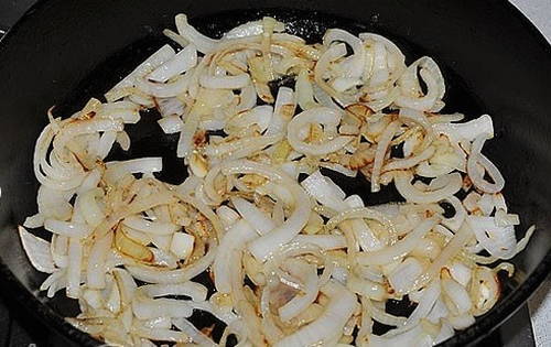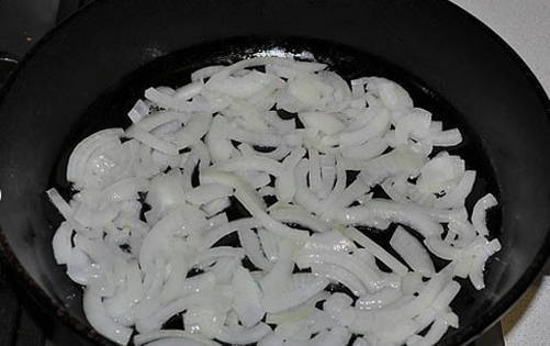 - Snijd de uien op een handige manier. Bak de groente in plantaardige olie tot hij bloost.