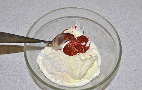 Bereid de jus in een aparte kom. Roer zure room met tomatenpuree en bloem tot een gladde massa.