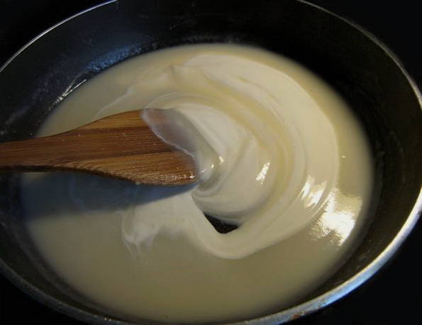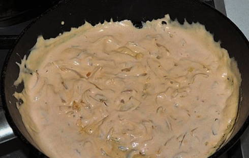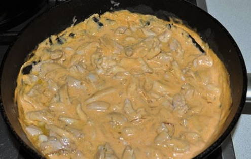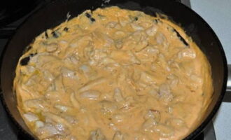 - Giet het vleesproduct met de benodigde hoeveelheid zure room en zet op laag vuur. We wachten tot de zure room kookt.