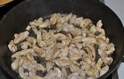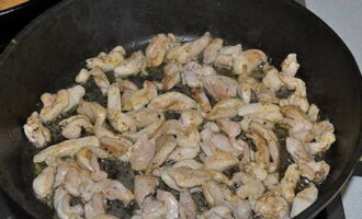 - Dompel elk stuk kip in gekruid zout. We doen het product in een koekenpan met plantaardige olie en bakken het tot het bloost.