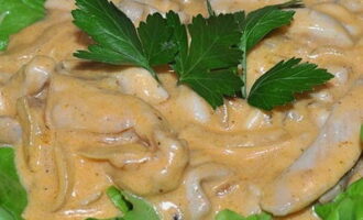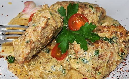 - Leg de afgewerkte kip in zure roomsaus op borden en serveer. Je kan het proberen!