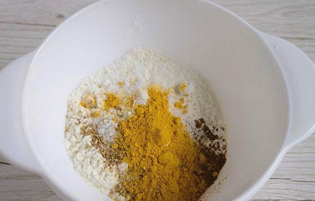 - Combineer de resterende bloem met zout, gemalen zwarte peper, kerrie en aromatische paprika in een apart bord. Wij mixen.