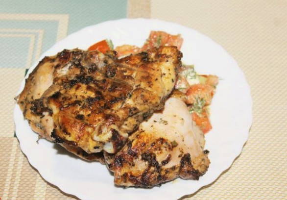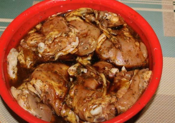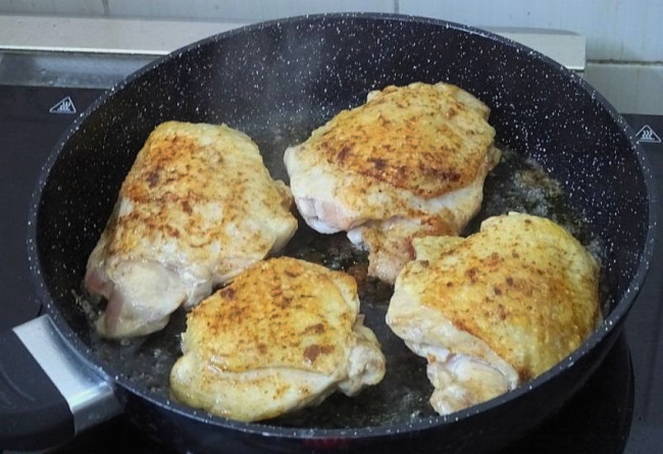 - Na een uur marineren is het product goed verzadigd met kruiden en sojasaus. Bak de voorbereide kippendijen tot ze blozend zijn.