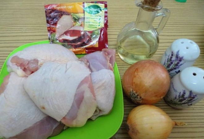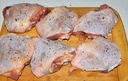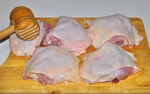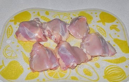 - We zullen de nodige producten bereiden volgens de lijst. Ontdooi de kippendijen van tevoren en was ze.