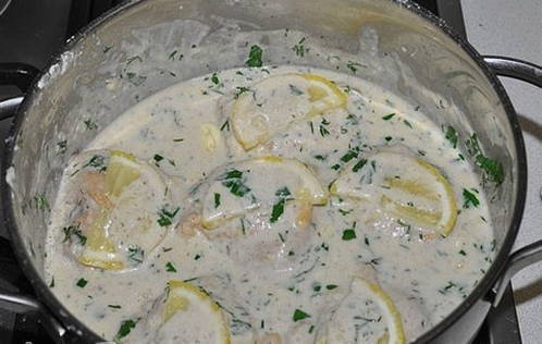 Malse kippendijen gestoofd in zure roomsaus