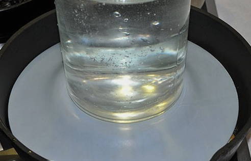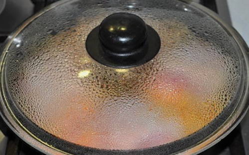 - Vervolgens bedekken we het product met een bord en plaatsen we de lading uit een glazen pot met water erop. Dit zal u helpen een helderdere blos te krijgen. 7 minuten koken.
