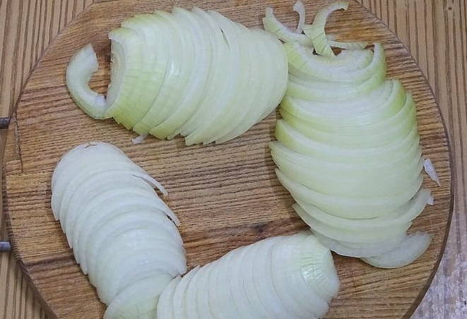 - We maken de uien schoon en snijden ze in halve ringen.