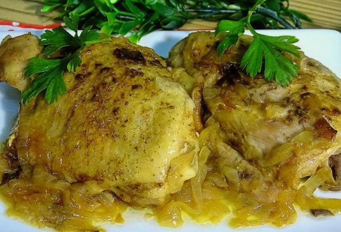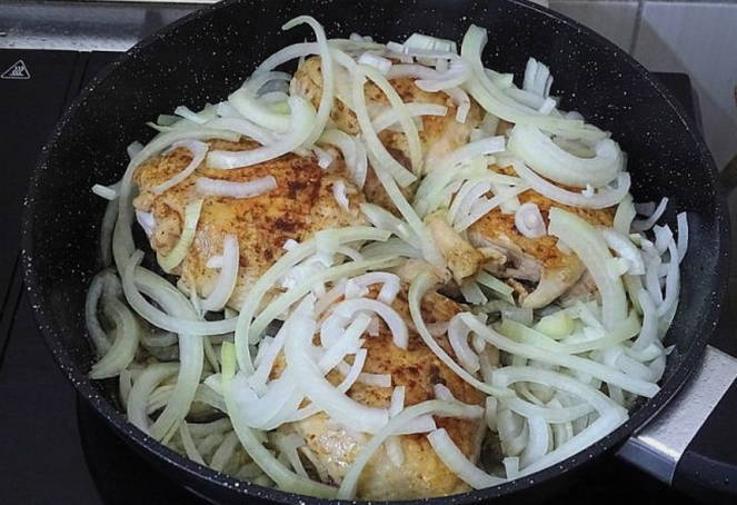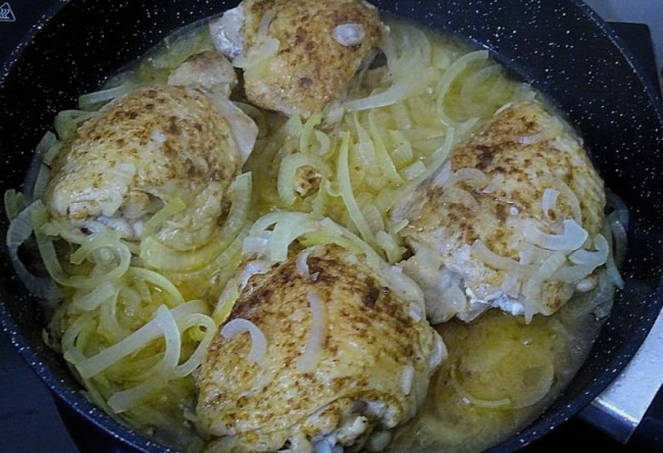 - Een eenvoudig en lekker recept voor kippendijen met uien in een pan
