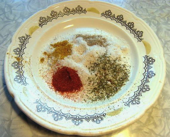 - Doe zout en droge kruiden in een gemeenschappelijk bord en roer ze door elkaar.