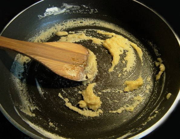 - Smelt een stukje boter in een andere pan. Hier voegen we ook meel aan toe. Roer en laat de ingrediënten sudderen tot een bruine tint verschijnt.