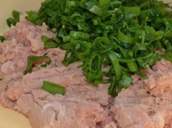 Was de groene uien goed en dep ze droog met keukenpapier. Snijd het in kleine ringen en combineer met de kippenbodem. Zout de massa, voeg kruiden toe en zet 15 minuten in de koelkast. Gedurende deze tijd zal het gehakt worden gevoed, het zal dichter en elastischer worden.