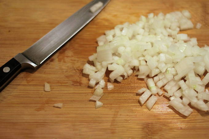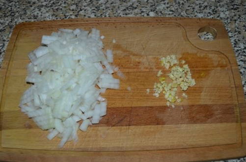 - Pel de ui en knoflook, spoel ze af. Snijd groenten in blokjes. Tip: bevochtig het mes bij het snijden van de ui. Dit zal je redden van de tranen die deze groente veroorzaakt.