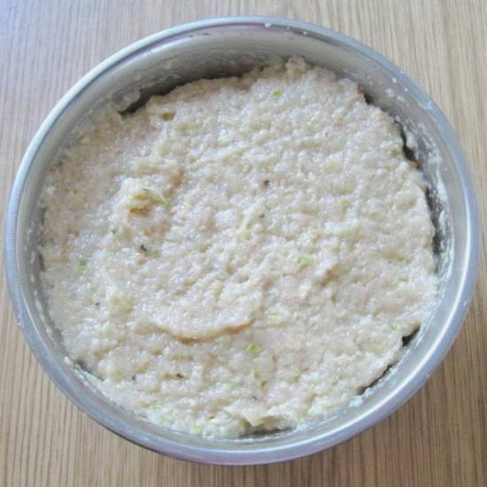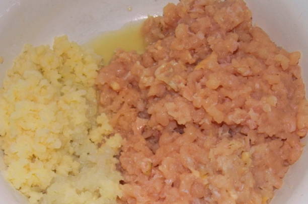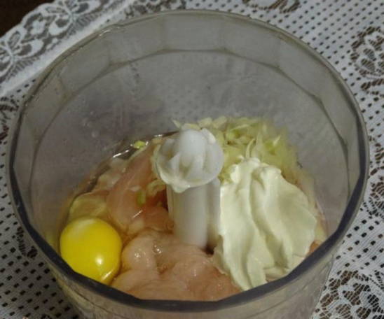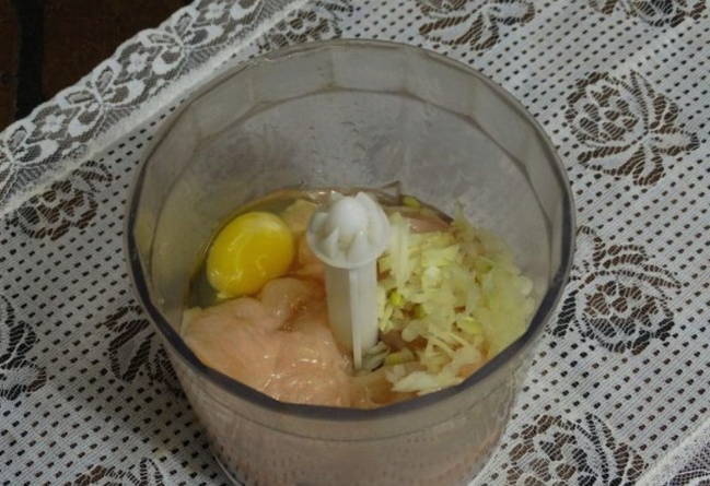 - Was en droog de kipfilet. Snijd overtollig vet en film af. Gebruik een vleesmolen of keukenmachine om de filets fijn te hakken. Pel de ui, spoel af met koud water. Schil de courgette en snij in kleine stukjes. Haal de groenten door een vleesmolen. Combineer al deze ingrediënten.