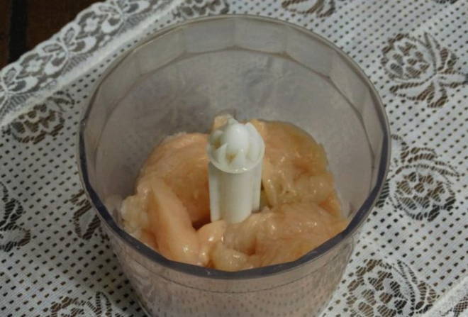 - Was de kipfilet goed. Scheid het vlees van de botten, verwijder het vel. Verdeel de resulterende filet in stukjes en haal door een vleesmolen.