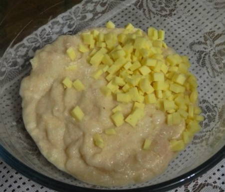 - Doe het mengsel in een diepe kom en voeg de in kleine blokjes gesneden kaas toe. Je kunt de kaas ook raspen op een grove rasp. Roer alles.